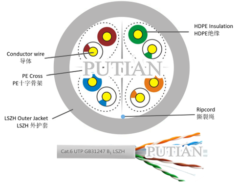 ■ 六类非屏蔽线缆,GB 31247 B1(d0,t1,a1)B1阻燃等级线缆